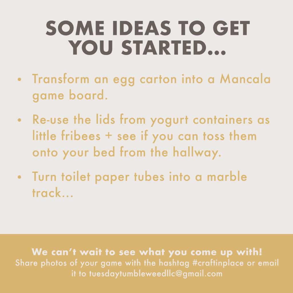 Bored of your board games? Transform an egg carton into a Mancala game board, or use the lids from yogurt containers as little frisbees and see if you can toss them onto your bed from the hallway. What games can you create with the materials you have? That empty can is ready to be transformed into a game!